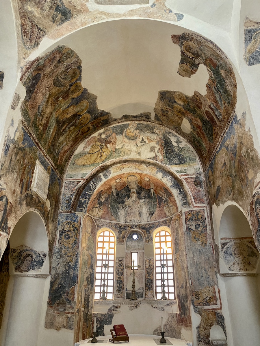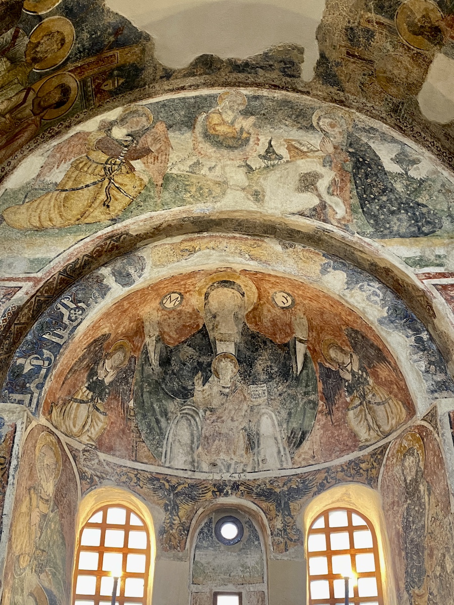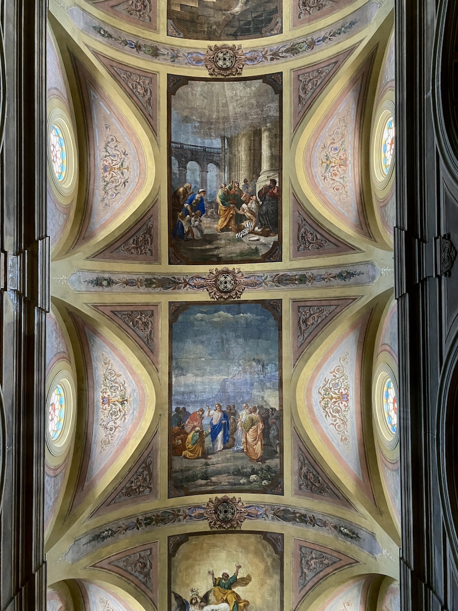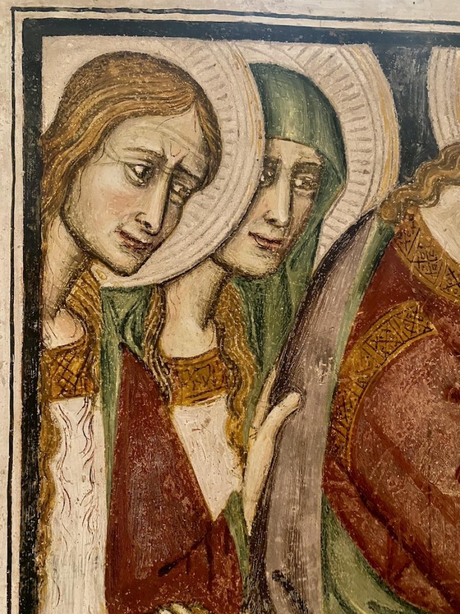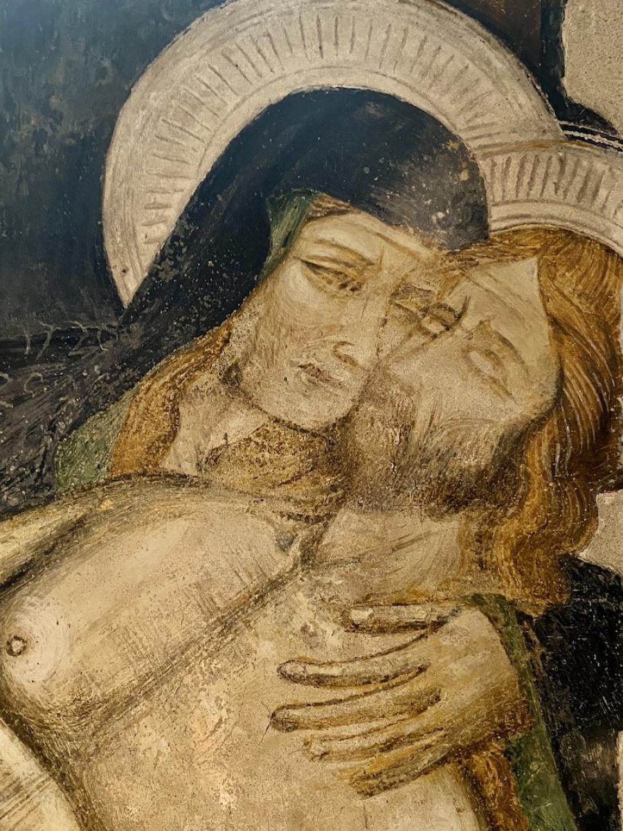 Hier stockt mir erstmal der Atem: Denn was es hier, in dieser 1391 fertiggestellten Kirche, zu sehen gibt, wirft mich um. Der fünfschiffige Innenraum ist fast über und über freskiert, das Auge gleitet erst mal über alles hinweg und versucht dann irgendwo einen Anfang zu finden. Aber wo beginnen, wo enden mit dem Lesen der unzähligen Geschichten, die diese bunten, beeindruckenden Fresken erzählen? Ich starte schließlich im ersten Schiff mit Szenen aus der Apokalypse, gefolgt von den Geschichten der Genesis (im zweiten Schiff). Eine eindeutige Engelsdominanz stelle ich im Gewölbe des dritten Schiffs fest. Besonders schön finde ich den Freskenzyklus an den Wänden des Chors: Dieser ist dem Leben meiner Namensvetterin Katharina von Alexandrien gewidmet. Und noch ein Highlight finde ich dann: Die besonders eindrücklichen Mariengeschichten an den Wänden im rechten Seitenschiff. Eine Antwort auf die Frage, warum die Kirche der heiligen Katharina von Alessandria gewidmet ist, habe ich schließlich auch noch gefunden: Ein (angeblicher) Finger der Heiligen wird bis heute als Reliquie in einem silbernen Reliquienschrein in der Schatzkammer der Kirche, im angeschlossenen Museum, aufbewahrt.