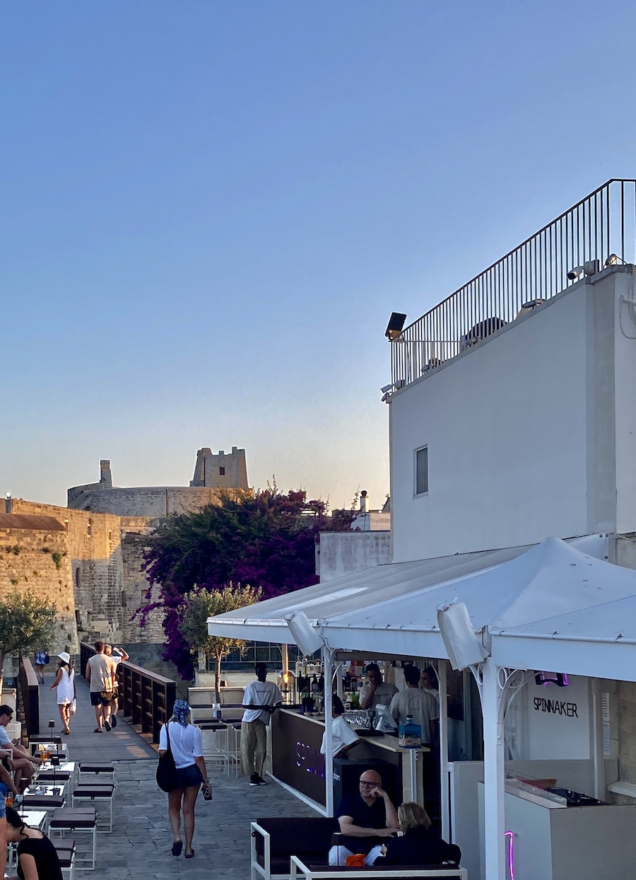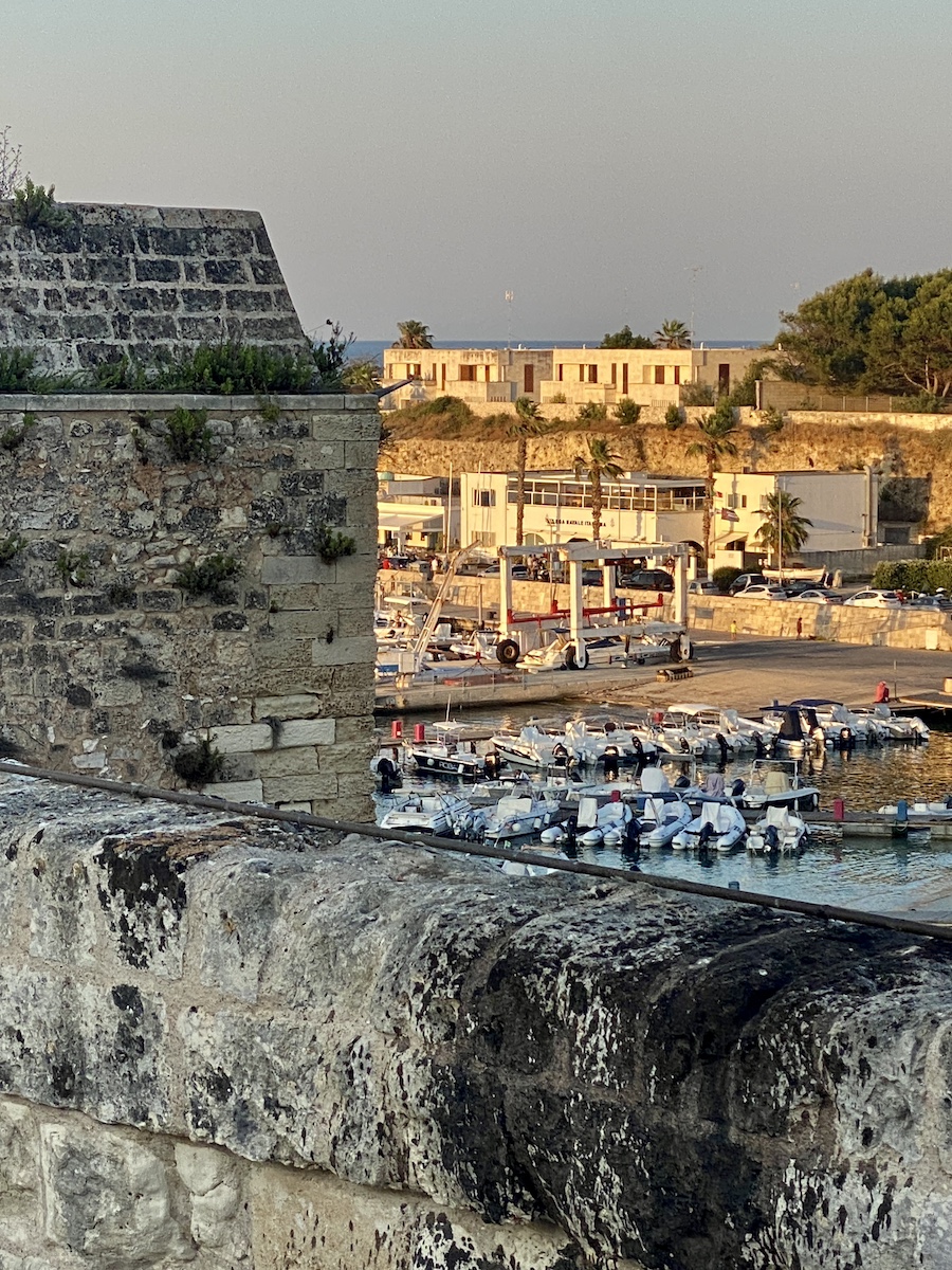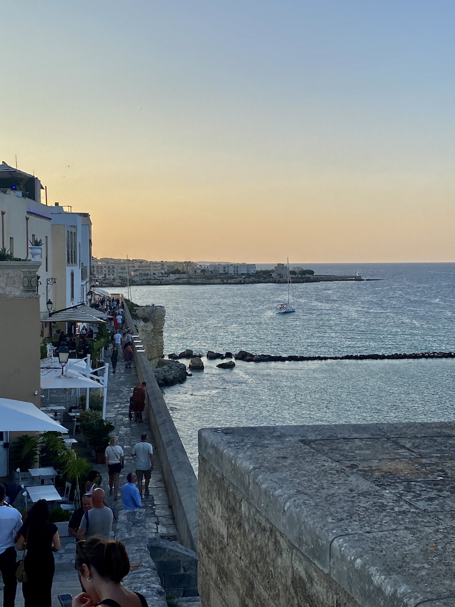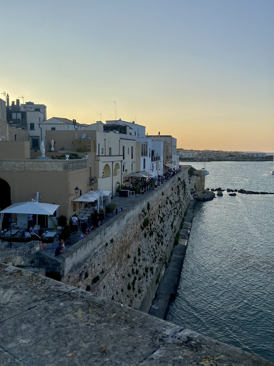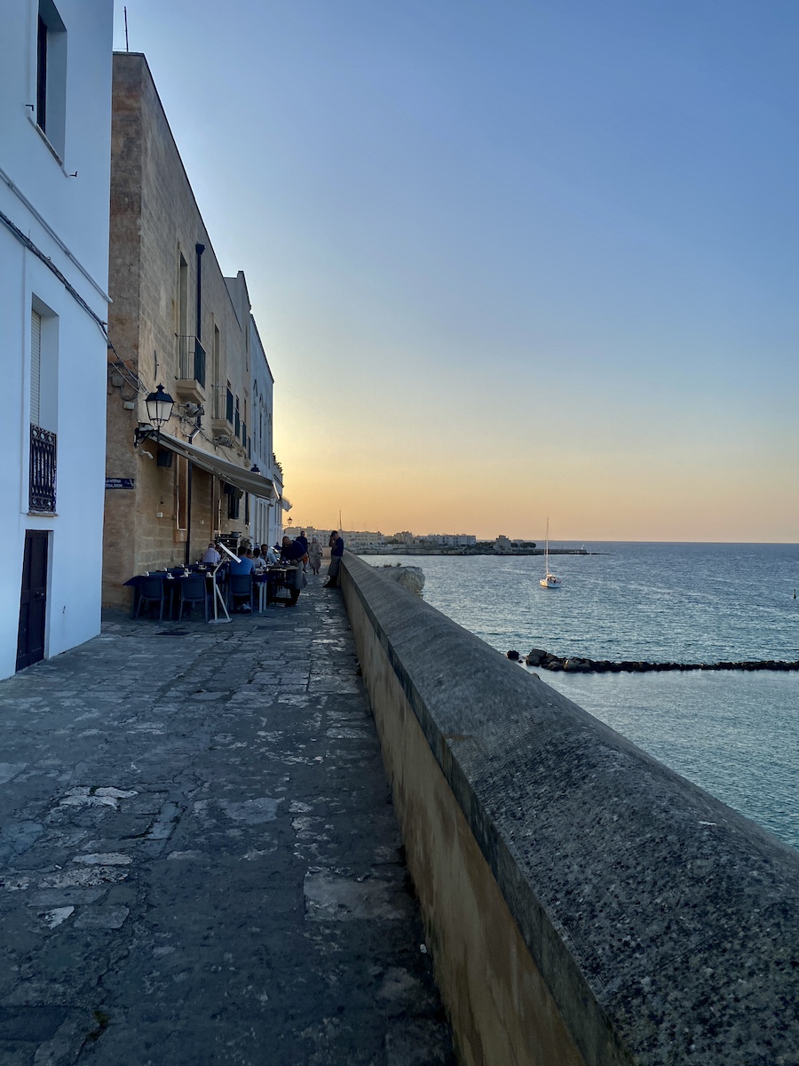 So ganz können wir uns auch danach noch nicht von Otranto lösen: Vorbei am mächtigen Castello geht es auf die Stadtmauern, und hätten wir nicht schon einen Aperitif genommen, dann würden wir hier definitiv einkehren, in der Lounge Bar Spinnaker. Gleich daneben lohnt sich von der Aussichtsplattform ein Blick auf Hafen, Meer und Himmel. Letzterer wirft sich so richtig ins Zeug und zeigt was er kann, nämlich Zuckerl-pastellfarben. Ewig könnte man hier stehen und den Punkt suchen, wo das himmelblaue Meer in den Abendhimmel übergeht. Aber wir reißen uns dann doch los und flanieren im schönsten Abendlicht entlang der Stadtmauer (wo sich so manches Restaurant befindet, mit schönen Ausblicken) zurück Richtung Parkplatz. Ach Otranto, du hast mir einmal mehr richtig gut gefallen…