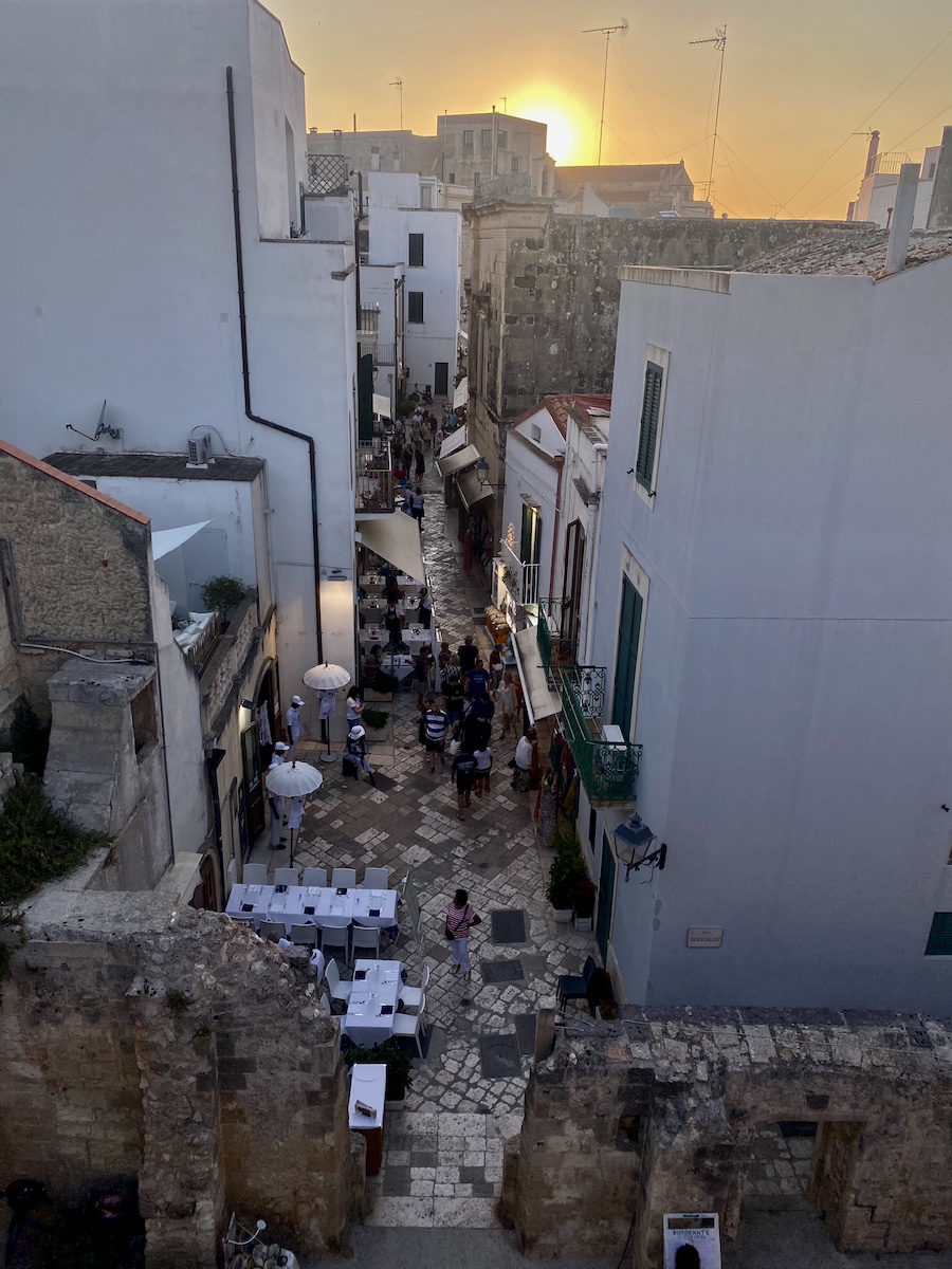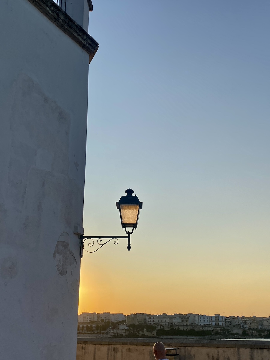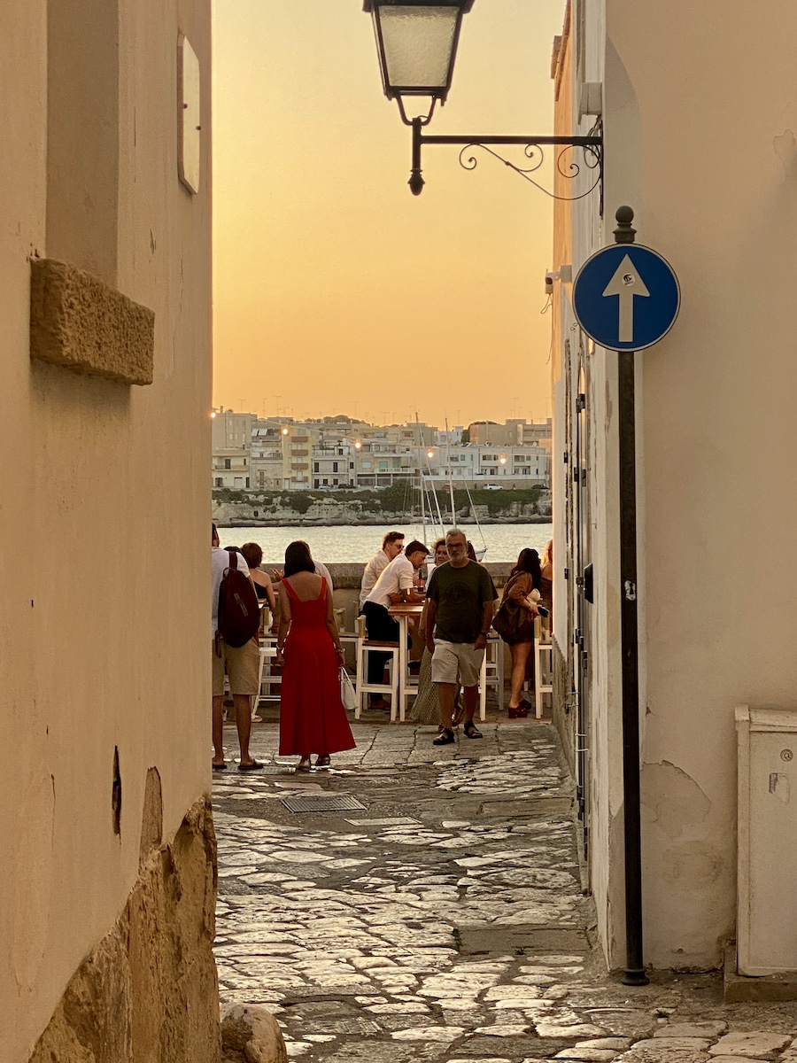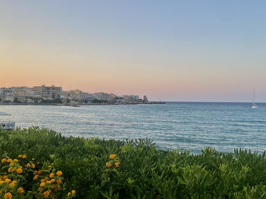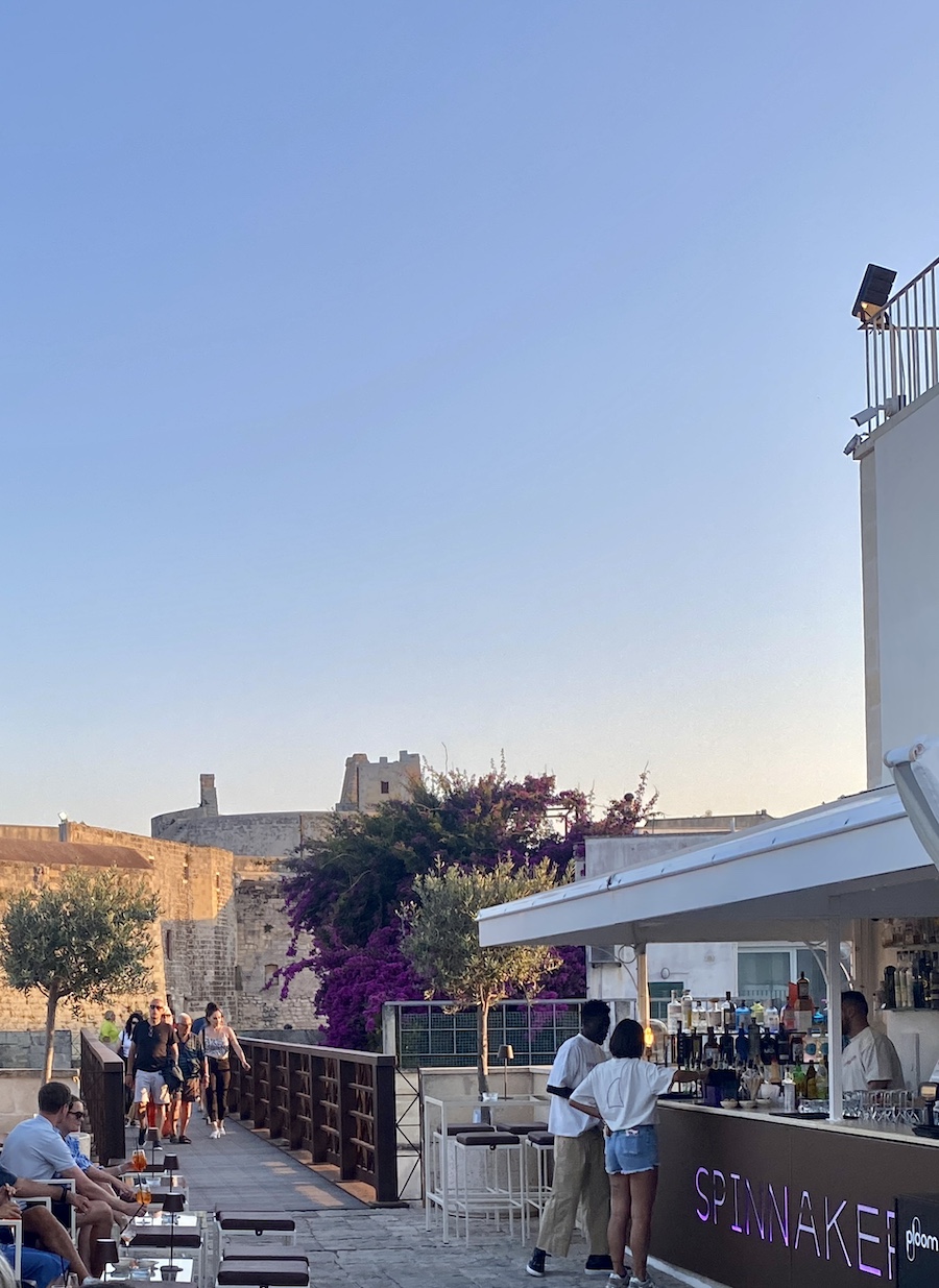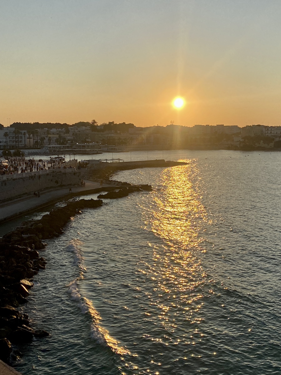So ganz können wir uns auch danach noch nicht von Otranto lösen: Vorbei am mächtigen Castello geht es auf die Stadtmauern, und hätten wir nicht schon einen Aperitif genommen, dann würden wir hier definitiv einkehren, in der Lounge Bar Spinnaker. Gleich daneben lohnt sich von der Aussichtsplattform ein Blick auf Hafen, Meer und Himmel. Letzterer wirft sich so richtig ins Zeug und zeigt was er kann, nämlich Zuckerl-pastellfarben. Ewig könnte man hier stehen und den Punkt suchen, wo das himmelblaue Meer in den Abendhimmel übergeht. Aber wir reißen uns dann doch los und flanieren im schönsten Abendlicht entlang der Stadtmauer (wo sich so manches Restaurant befindet, mit schönen Ausblicken) zurück Richtung Parkplatz. Ach Otranto, du hast mir einmal mehr richtig gut gefallen…