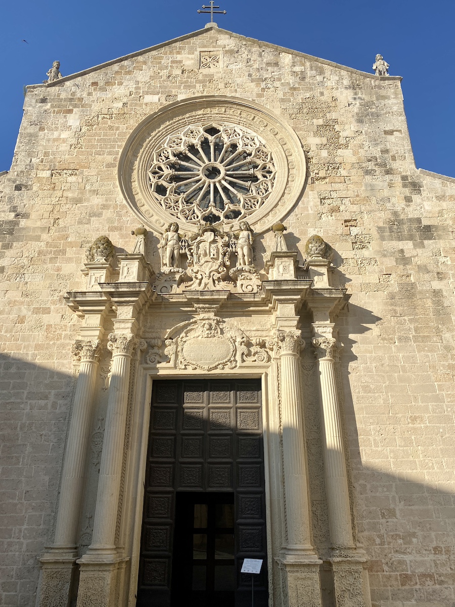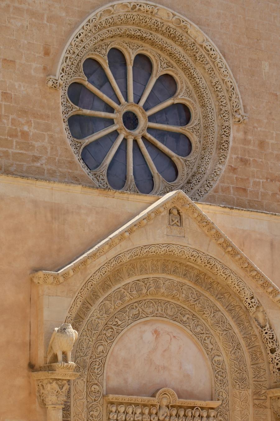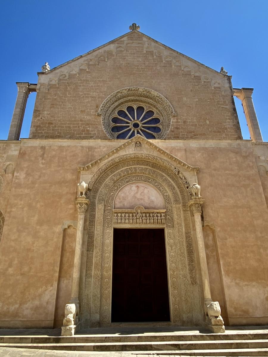 Komm, sagt mein Mann, reiß dich los, wir müssen in die Basilika Santa Caterina d’Alessandria, bevor sie uns dort zu Mittag die Tür vor der Nase zuknallen. Und dann stehen wir auch schon davor, auch sie hat einen großen Auftritt an einer weitläufigen Piazza und kurz bin ich versucht mich im dortigen Cafè unter den Sonnenschirmen niederzulassen und mir bei einem kühlen Getränk einfach mal die Fassade im Detail anzusehen. Diese überzeugt mich nämlich sowohl farblich (mit einem zarten Rosè-Ton) als auch mit ihrem apulisch-romanischen Stil und dem wunderschönen Portal. Aber das kühle Getränk muss warten – und schon stehe ich, nach einer kleinen Spende für den Eintritt, im Inneren der Basilika.