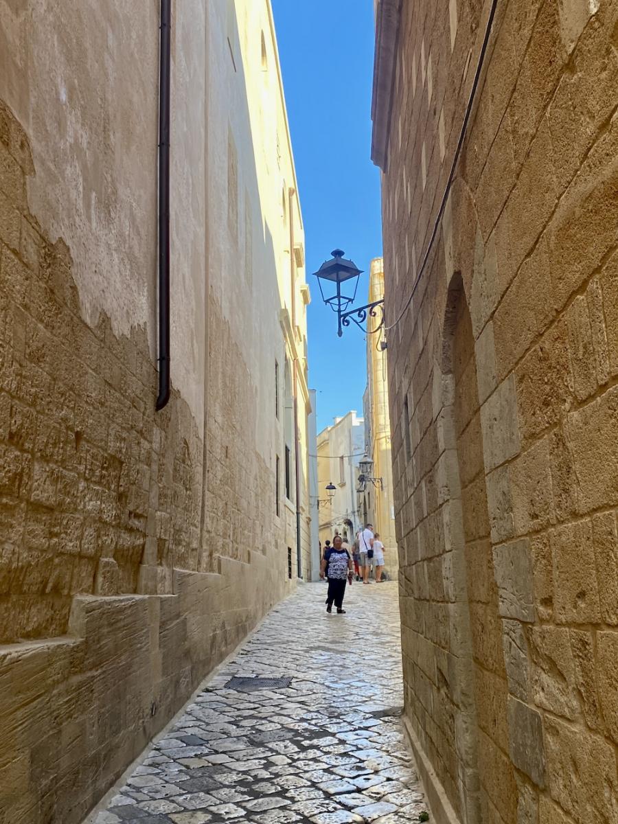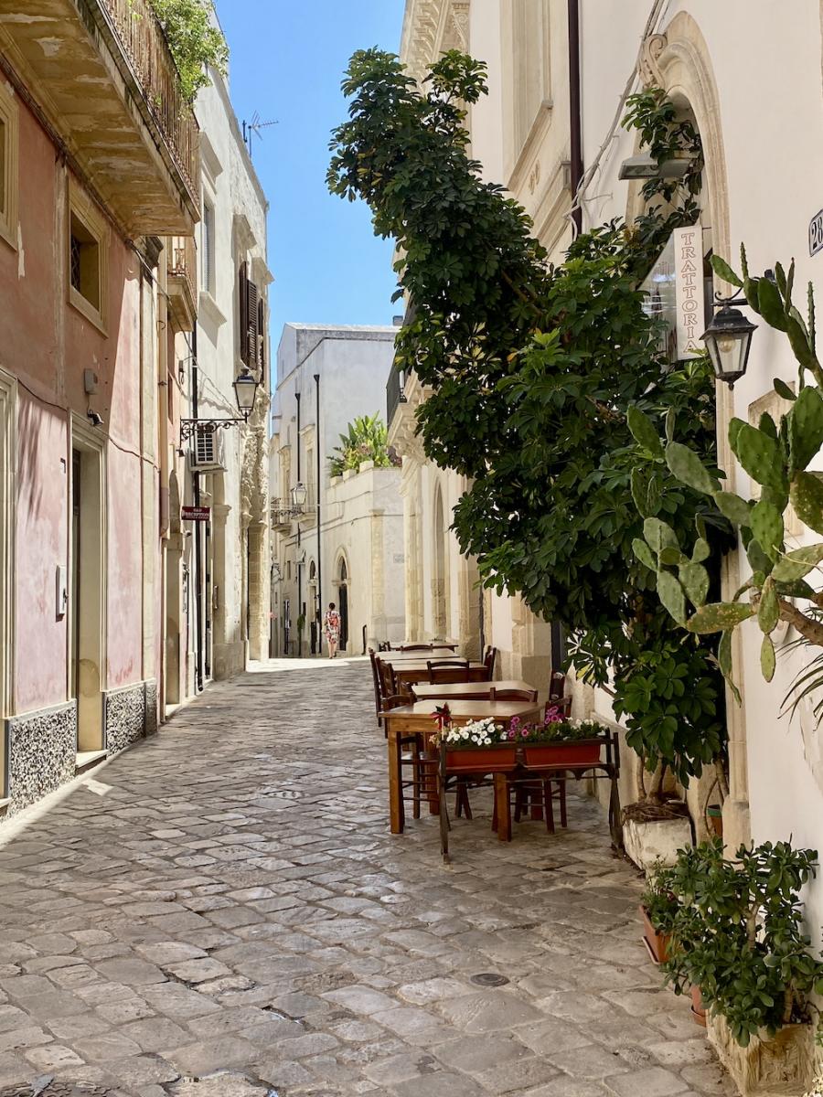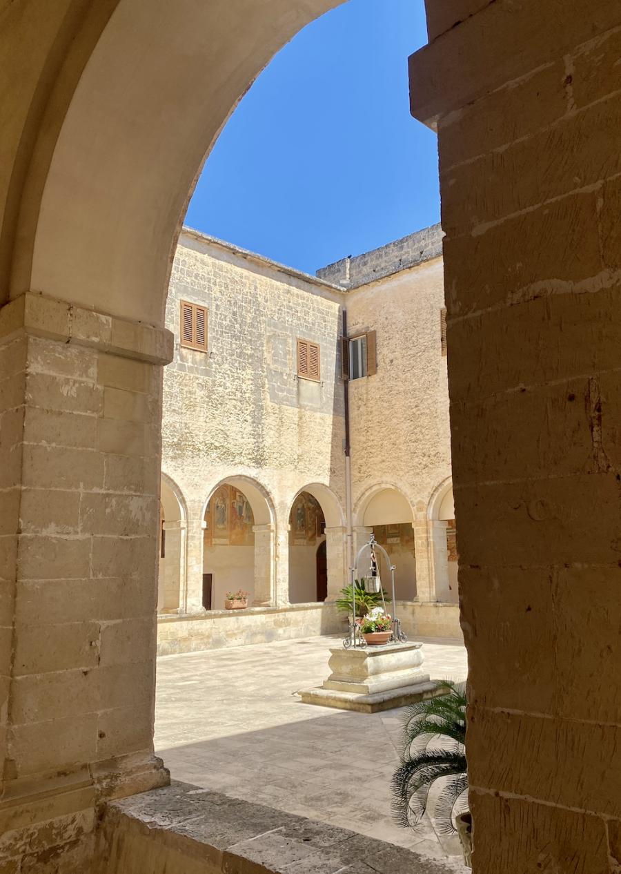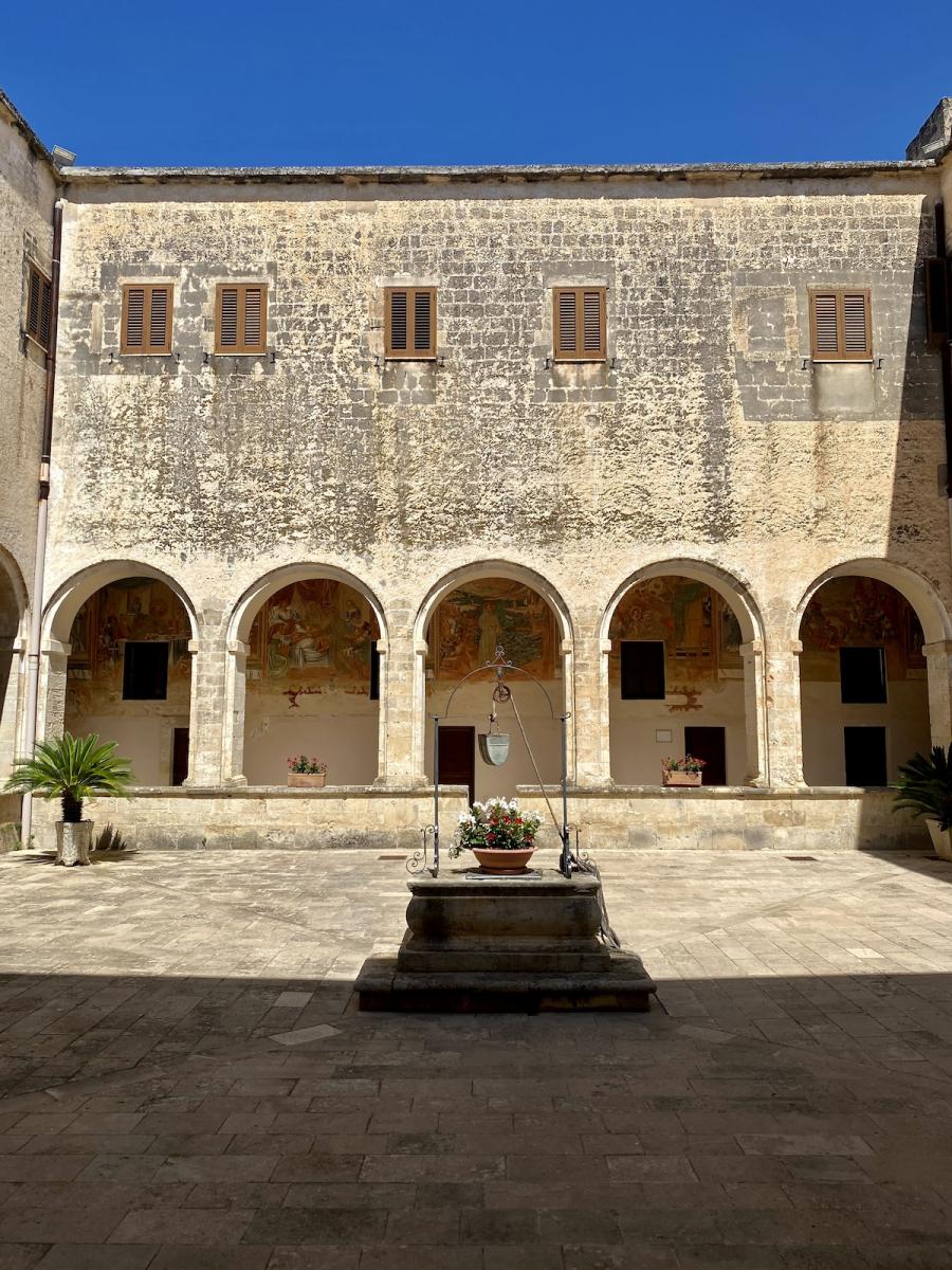 Berühmte Fresken sind es vorderhand, die uns in die 25.000-Einwohner:innen-Stadt Galatina ziehen. Aber dann machen wir uns erst einmal auf in das Gassengewirr dieser hübschen kleinen Stadt, die im Landesinneren und rund 20 Kilometer südlich von Lecce liegt. Großteils bereits liebevoll und aufwändig saniert sind hier die meisten Häuser in der Altstadt, an einigen wird gerade intensiv gearbeitet. Helle, vielfach farbige Fassaden, zahlreiche mächtige Palazzi, eindrucksvoll geschmückte Torbögen, hübsche Innenhöfe – hier hat das Auge gut zu tun. Restaurants und Cafès, dazwischen hübsche Geschäfte, die Altstadt wirkt lebendig und anziehend, auch wenn hier an diesem frühen und doch schon heißen Juni-Vormittag noch wenige Menschen unterwegs sind. Besser besucht sind da hingegen die Schanigärten der Cafès, in denen dem Espresso gehuldigt wird – bevor dann die für den Tag zu erwartende ganz große Hitze endgültig heraufziehen und sich schwer auf die Straßen Galatinas legen wird.